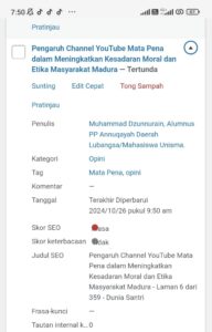 Rabu (13/11/2024) hari ini, sedianya kami akan melakukan editing lalu merilis tulisan berjudul “Pengaruh Channel Youtibe Mata Pena dalam Meningkatkan Kesadaran Moral dan Etika Masyarakat Madura”. Naskah tersebut disubmit oleh akun atas nama Muhammad Dzunnurain pada tanggal 26 Oktober 2024 pukul 09.50 WIB.