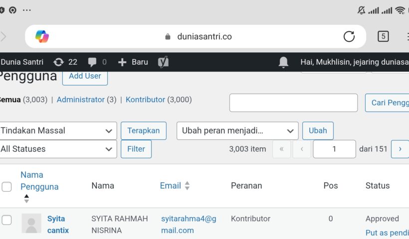 Luar biasa! Hari ini, Minggu (18/5/2025), jumlah akun penulis atau kontributor di web duniasantri.co telah menembus angka 3.000. Persisnya, hingga pukul 19.30 WIB terekam ada…