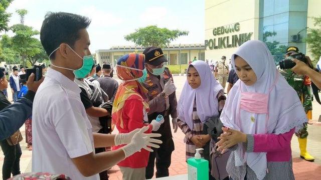 Ada lima unit bus yang membawa ratusan santri ini. Begitu tiba di area Masjid Al-Jabar, Kecamatan Plumbon, Kabupaten Cirebon yang difungsikan sebagai area check point penanganan corona, para santri disambut petugas medis lengkap dengan peralatan dan baju pelindung. Satu per satu santri diperiksa kesehatannya. Termasuk, penyemprotan disinfektan ke semua barang bawaan mereka. Para santri juga diminta mengisi formulir data.